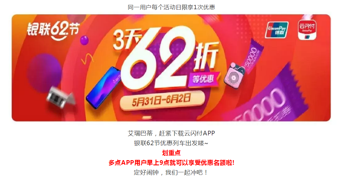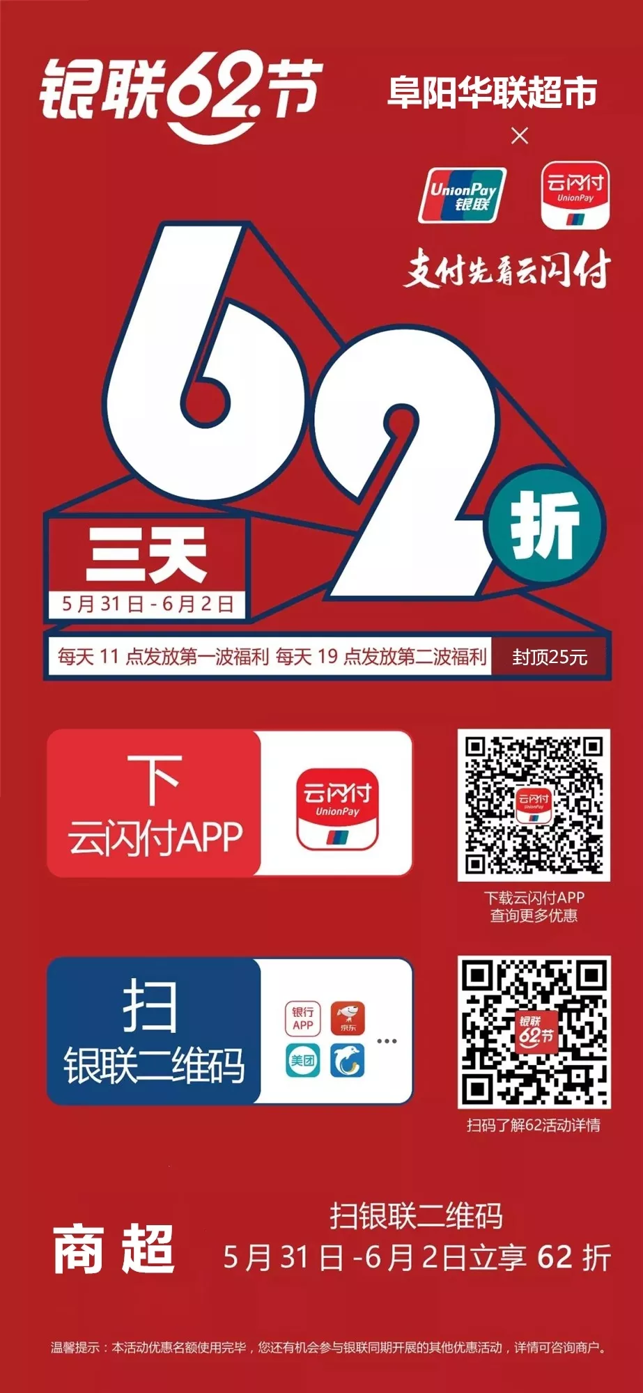 【阜陽(yáng)華聯(lián)】銀聯(lián)62節,3天62折!百萬(wàn)現金等你來(lái)瓜分!