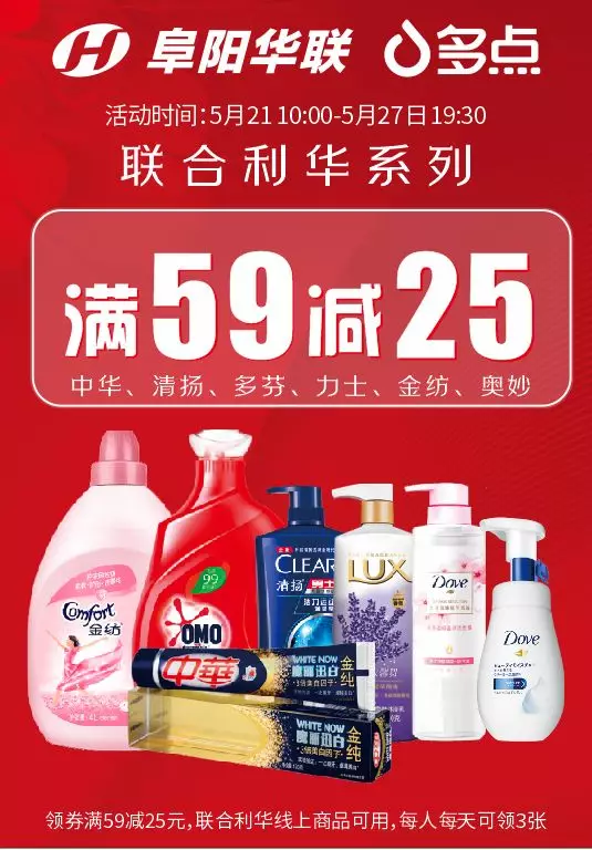 阜陽(yáng)華聯(lián)攜手聯(lián)合利華線(xiàn)上全場(chǎng)滿(mǎn)59減25