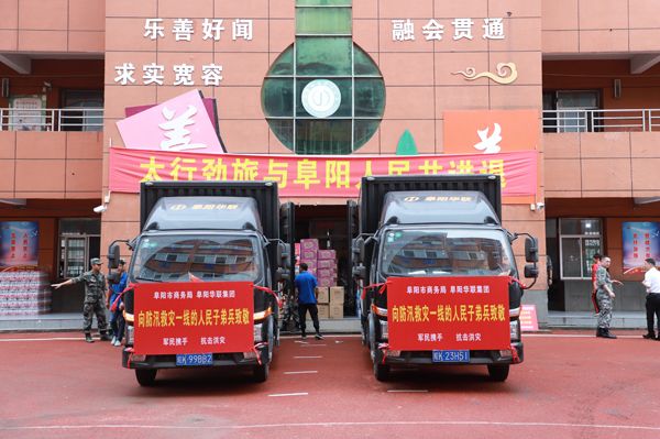 當天上午,阜陽(yáng)華聯(lián)集團為他們送去了200件礦泉水、200件方便面、100件火腿腸。